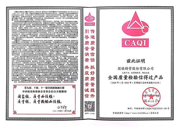 公司堅持以質(zhì)量為生命,以滿足用戶需求作為自己的追求,依靠雄厚的技術(shù)力量和先進的生產(chǎn)、檢測設(shè)備,對生鐵、球墨鑄鐵管產(chǎn)品進行全過程控制,產(chǎn)品質(zhì)量得到全面的保證